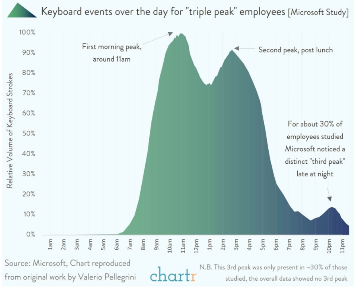 En comptant le nombre de frappes effectuées sur le clavier, le responsable de la recherche chez Microsoft a cartographié la journée de travail type d’un groupe d’employés de l’entreprise. Le constat : la journée est divisée en 2 gros pics de productivité, 11h et 15h, ce qui semble assez logique. Mais un troisième pic semble se dessiner désormais aux alentours de 22h, où près de 30 % des employés étudiés se reconnectent pour une session de travail nocturne.